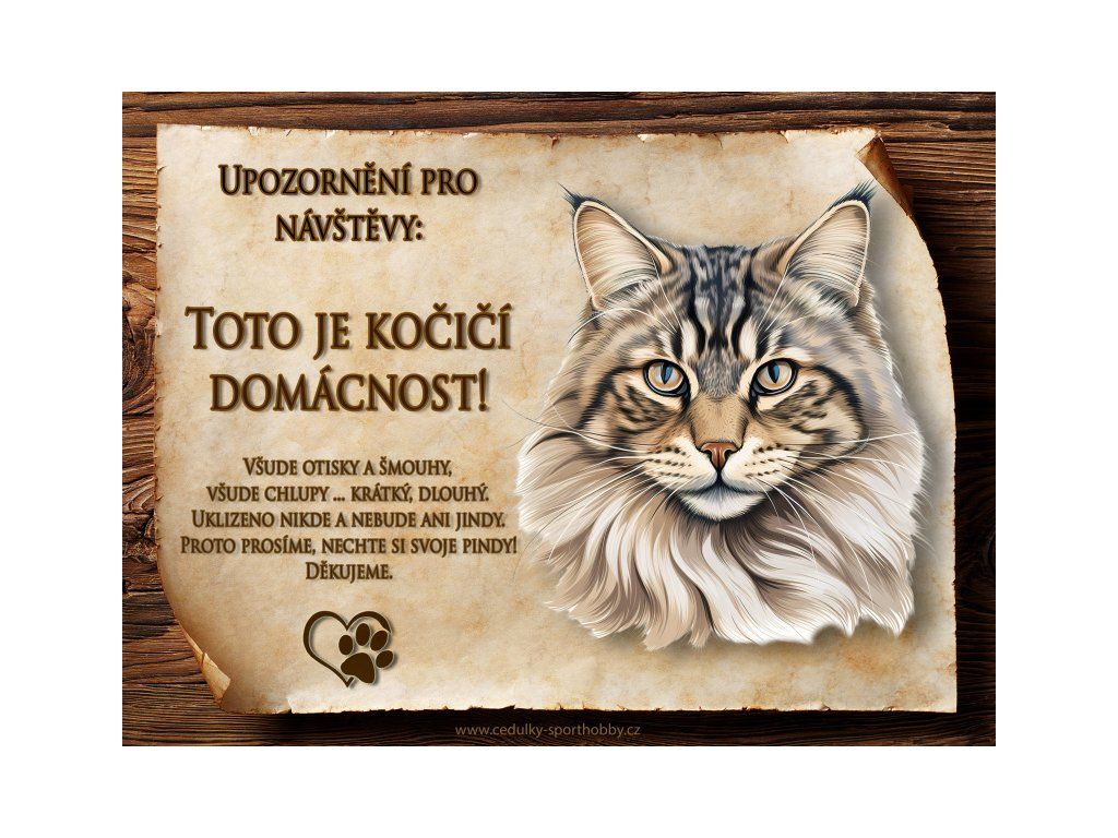 Tuto cedulku vyrábíme v češtině i slovenštině. Vtipná kovová cedulka s nápisem "Kočičí domácnost ..." vyobrazení plemene Sibiřská 4. Kovová - hliníková cedulka vhodná pro umístění do domu i na venek. Velikosti této cedulky je 20x15 cm, má zakulacené rohy. Cedulky jsou tištěny sublimační technologií Grawerton přímo na plech.