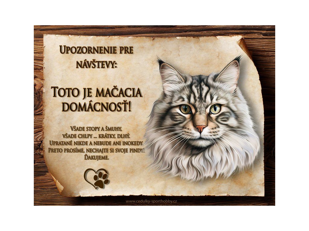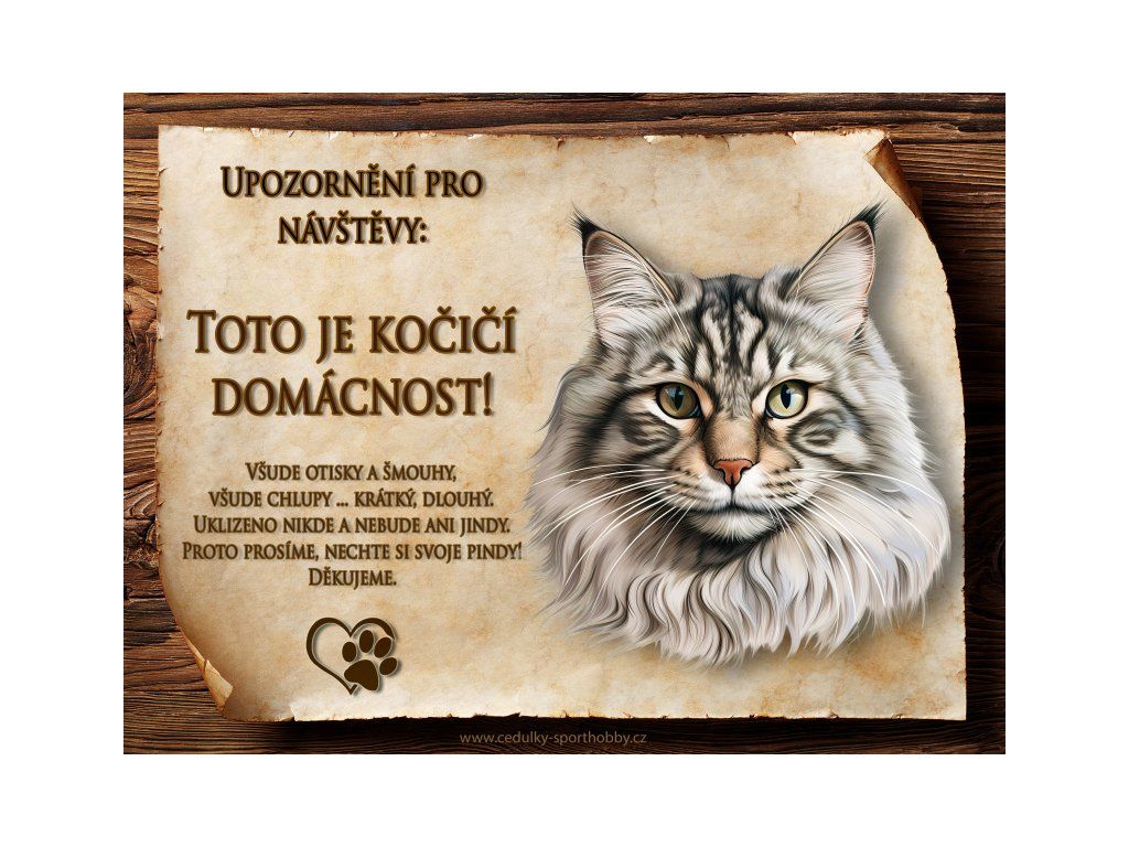 Tuto cedulku vyrábíme v češtině i slovenštině. Vtipná kovová cedulka s nápisem "Kočičí domácnost ..." vyobrazení plemene Sibiřská 5. Kovová - hliníková cedulka vhodná pro umístění do domu i na venek. Velikosti této cedulky je 20x15 cm, má zakulacené rohy. Cedulky jsou tištěny sublimační technologií Grawerton přímo na plech.