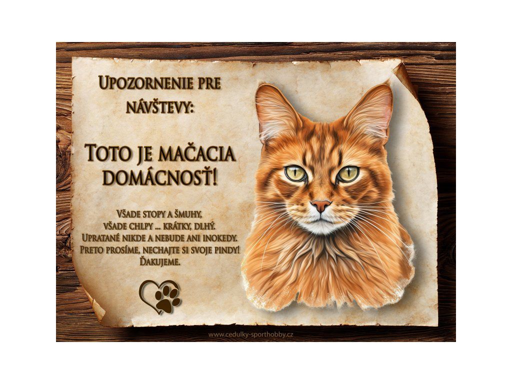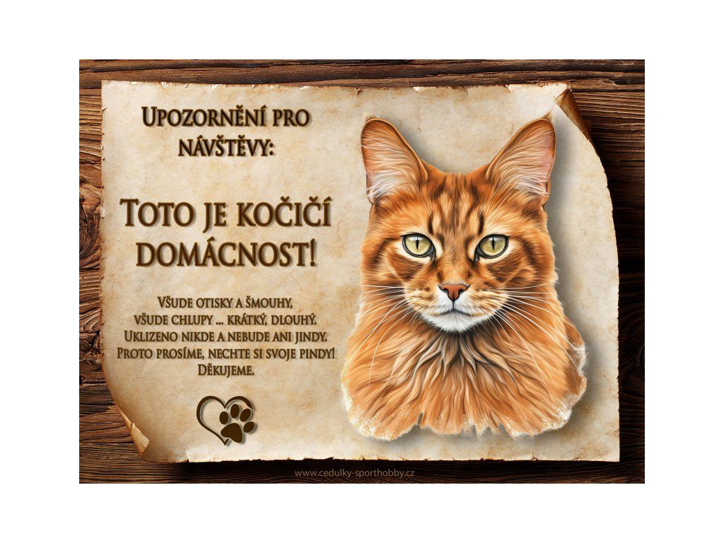 Tuto cedulku vyrábíme v češtině i slovenštině. Vtipná kovová cedulka s nápisem "Kočičí domácnost ..." vyobrazení plemene Somálská. Kovová - hliníková cedulka vhodná pro umístění do domu i na venek. Velikosti této cedulky je 20x15 cm, má zakulacené rohy. Cedulky jsou tištěny sublimační technologií Grawerton přímo na plech.