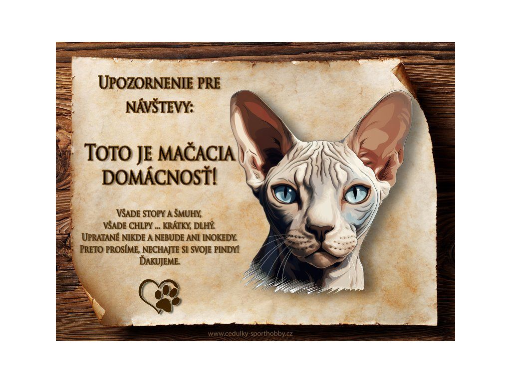 Tuto cedulku vyrábíme v češtině i slovenštině. Vtipná kovová cedulka s nápisem "Kočičí domácnost ..." vyobrazení plemene Sphynx. Kovová - hliníková cedulka vhodná pro umístění do domu i na venek. Velikosti této cedulky je 20x15 cm, má zakulacené rohy. Cedulky jsou tištěny sublimační technologií Grawerton přímo na plech.
