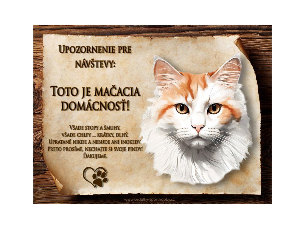 Tuto cedulku vyrábíme v češtině i slovenštině. Vtipná kovová cedulka s nápisem "Kočičí domácnost ..." vyobrazení plemene Turecká van 2. Kovová - hliníková cedulka vhodná pro umístění do domu i na venek. Velikosti této cedulky je 20x15 cm, má zakulacené rohy. Cedulky jsou tištěny sublimační technologií Grawerton přímo na plech.