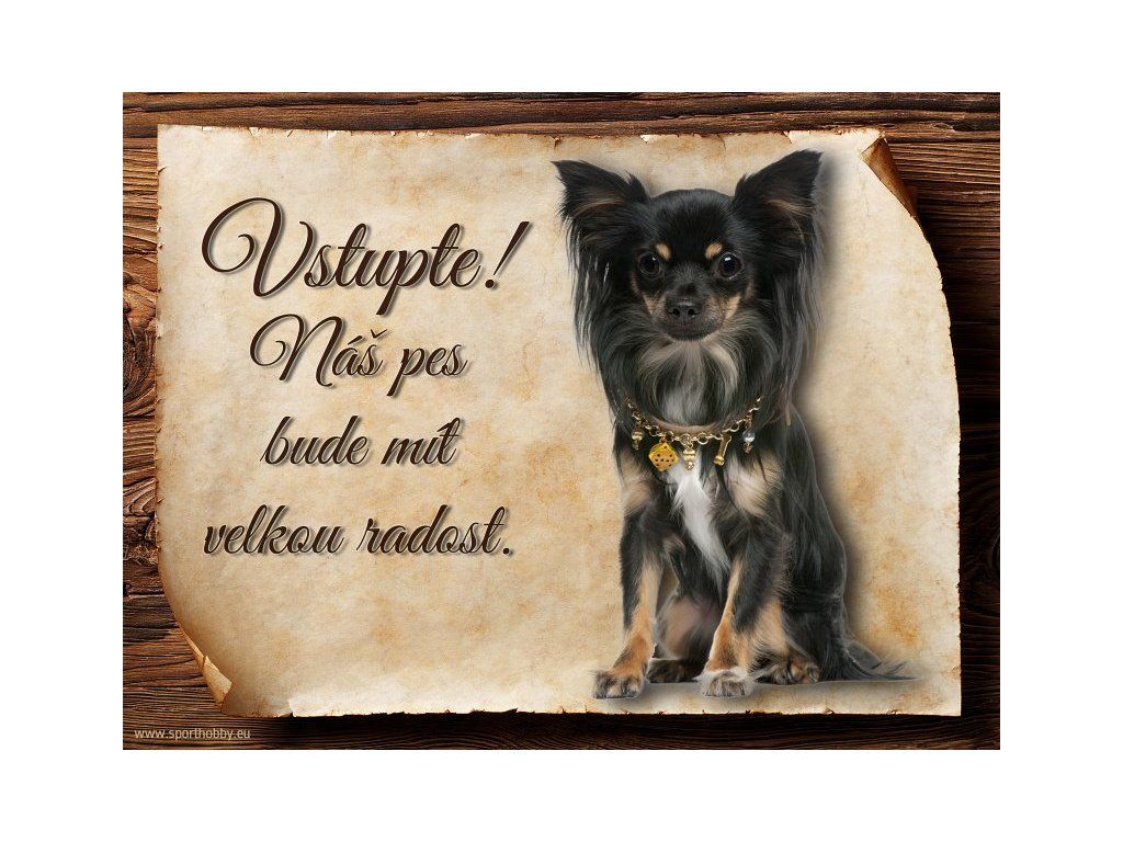 Cedulka s Čivavou I, hliníková s nápisem "Vstupte! Náš pes bude mít velkou radost!" Kovová výstražná venkovní tabulka oznamující to či ono, že se ve vašem obydlí může návštěvník setkat s vašim čtyřnohým miláčkem a jeho teritoriem. Velikosti těchto cedulek jsou 15x11,25 a 20x15 cm. Cedulky jsou tištěny sublimační technologií Grawerton přímo na plech. Cedulky dodáváme běžně se zakulacenými rohy. Pokud budete chtít na cedulku vlastní text, napište nám jej do poznámky.