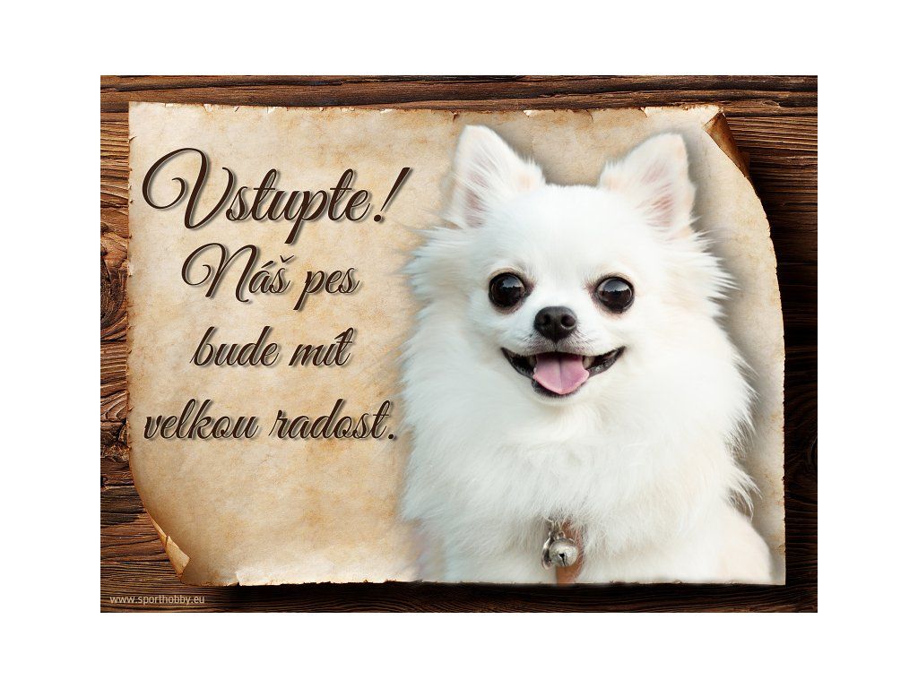 Cedulka Čivava II, hliníková s nápisem "Vstupte! Náš pes bude mít velkou radost!" Kovová výstražná venkovní cedulka oznamující to či ono, že se ve vašem obydlí může návštěvník setkat s vašim čtyřnohým miláčkem a jeho teritoriem. Velikosti těchto cedulek jsou 15x11,25 a 20x15 cm. Cedulky jsou tištěny sublimační technologií Grawerton přímo na plech. Cedulky dodáváme běžně se zakulacenými rohy. Pokud budete chtít na cedulku vlastní text, napište nám jej do poznámky.