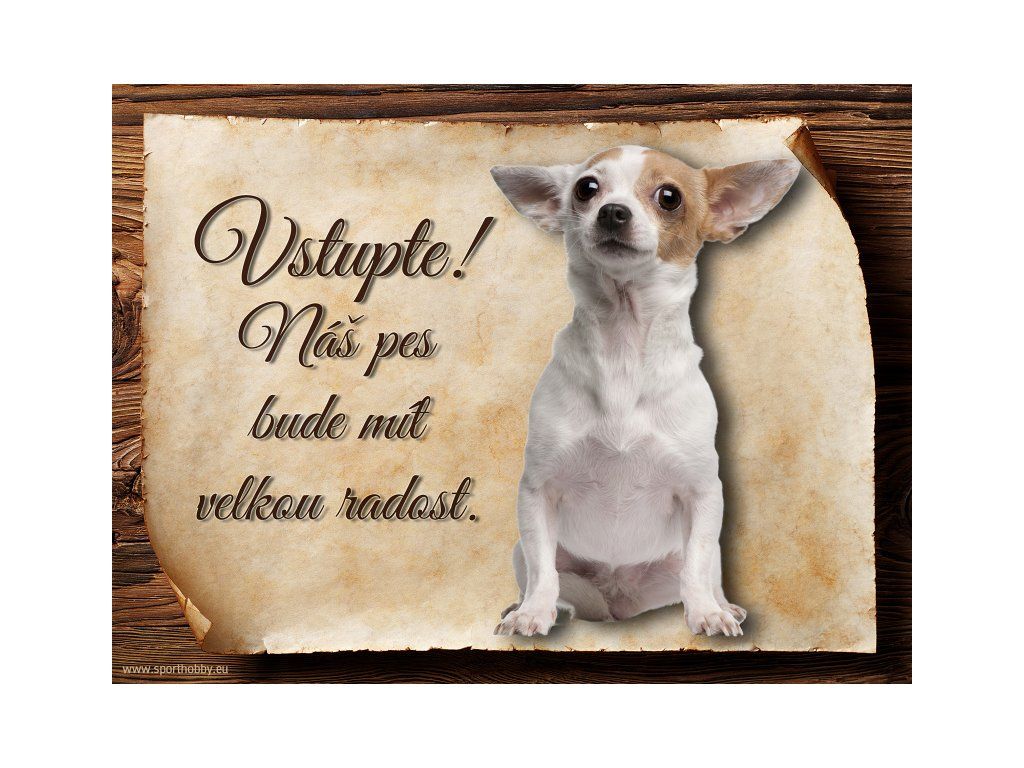 Cedulka Čivava III, hliníková s nápisem "Vstupte! Náš pes bude mít velkou radost!" Kovová výstražná venkovní cedulka oznamující to či ono, že se ve vašem obydlí může návštěvník setkat s vašim čtyřnohým miláčkem a jeho teritoriem. Velikosti těchto cedulek jsou 15x11,25 a 20x15 cm. Cedulky jsou tištěny sublimační technologií Grawerton přímo na plech. Cedulky dodáváme běžně se zakulacenými rohy. Pokud budete chtít na cedulku vlastní text, napište nám jej do poznámky.