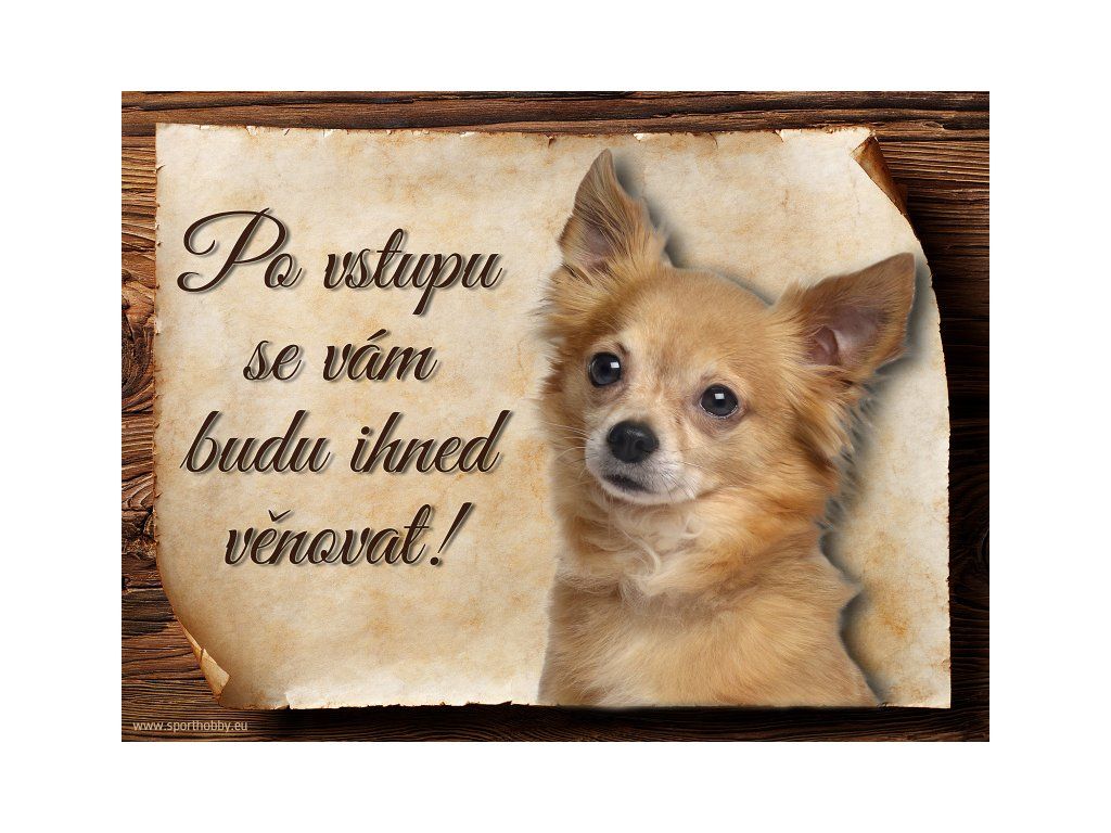 Cedulka Čivava IV, hliníková s nápisem "Po vstupu se vám budu hned věnovat!" Kovová výstražná venkovní cedulka oznamující to či ono, že se ve vašem obydlí může návštěvník setkat s vašim čtyřnohým miláčkem a jeho teritoriem. Velikosti těchto cedulek jsou 15x11,25 a 20x15 cm. Cedulky jsou tištěny sublimační technologií Grawerton přímo na plech. Cedulky dodáváme běžně se zakulacenými rohy. Pokud budete chtít na cedulku vlastní text, napište nám jej do poznámky.
