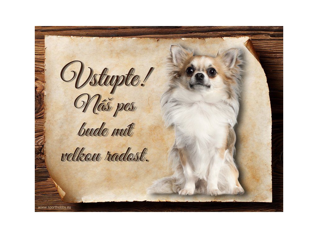 Cedulka Čivava V, hliníková s nápisem "Vstupte! Náš pes bude mít velkou radost!" Kovová výstražná venkovní cedulka oznamující to či ono, že se ve vašem obydlí může návštěvník setkat s vašim čtyřnohým miláčkem a jeho teritoriem. Velikosti těchto cedulek jsou 15x11,25 a 20x15 cm. Cedulky jsou tištěny sublimační technologií Grawerton přímo na plech. Cedulky dodáváme běžně se zakulacenými rohy. Pokud budete chtít na cedulku vlastní text, napište nám jej do poznámky.
