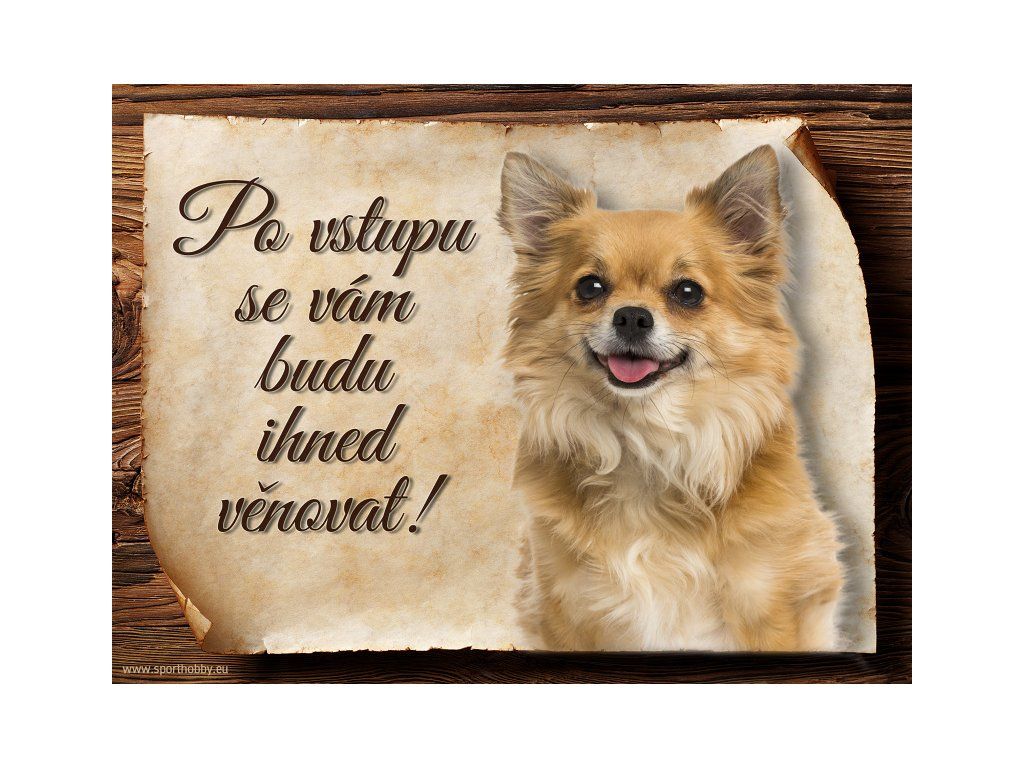 Cedulka Čivava VI, hliníková s nápisem "Po vstupu se vám budu hned věnovat!" Kovová výstražná venkovní cedulka oznamující to či ono, že se ve vašem obydlí může návštěvník setkat s vašim čtyřnohým miláčkem a jeho teritoriem. Velikosti těchto cedulek jsou 15x11,25 a 20x15 cm. Cedulky jsou tištěny sublimační technologií Grawerton přímo na plech. Cedulky dodáváme běžně se zakulacenými rohy. Pokud budete chtít na cedulku vlastní text, napište nám jej do poznámky.