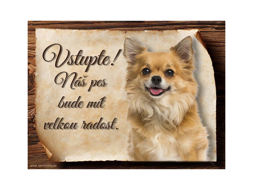 Cedulka Čivava VI, hliníková s nápisem "Vstupte! Náš pes bude mít velkou radost!" Kovová výstražná venkovní cedulka oznamující to či ono, že se ve vašem obydlí může návštěvník setkat s vašim čtyřnohým miláčkem a jeho teritoriem. Velikosti těchto cedulek jsou 15x11,25 a 20x15 cm. Cedulky jsou tištěny sublimační technologií Grawerton přímo na plech. Cedulky dodáváme běžně se zakulacenými rohy. Pokud budete chtít na cedulku vlastní text, napište nám jej do poznámky.
