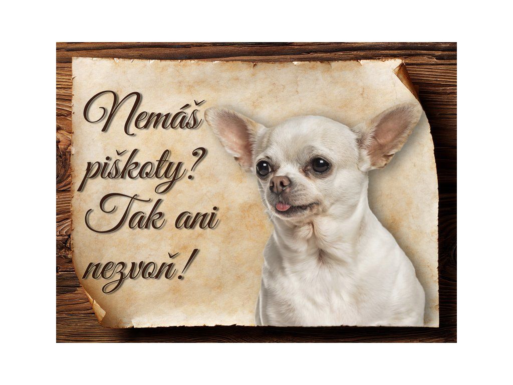 Cedulka s Čivavou VII, hliníková s nápisem "Nemáš piškoty? Tak ani nezvoň!" Kovová výstražná venkovní cedulka oznamující to či ono, že se ve vašem obydlí může návštěvník setkat s vašim čtyřnohým miláčkem a jeho teritoriem. Velikosti těchto cedulek jsou 15x11,25 a 20x15 cm. Cedulky jsou tištěny sublimační technologií Grawerton přímo na plech. Cedulky dodáváme běžně se zakulacenými rohy. Pokud budete chtít na cedulku vlastní text, napište nám jej do poznámky.