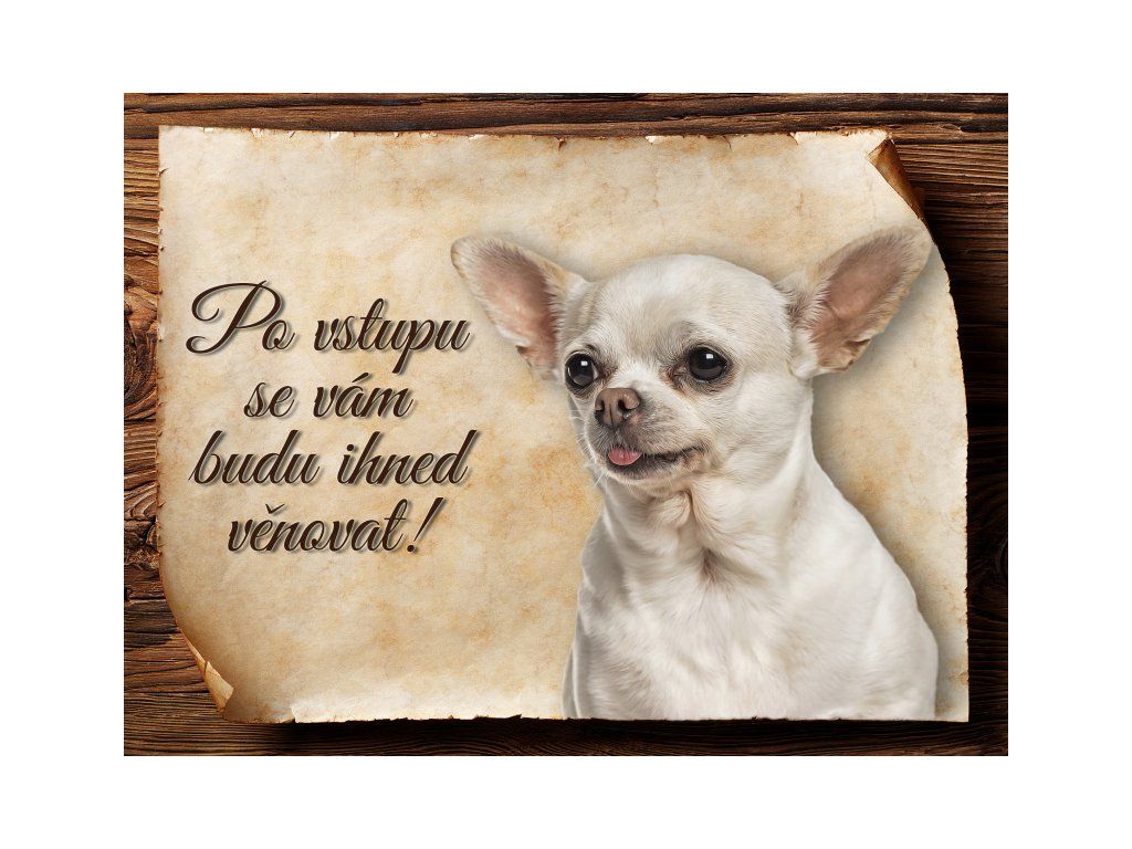 Cedulka Čivava VII, hliníková s nápisem "Po vstupu se vám budu hned věnovat!" Kovová výstražná venkovní cedulka oznamující to či ono, že se ve vašem obydlí může návštěvník setkat s vašim čtyřnohým miláčkem a jeho teritoriem. Velikosti těchto cedulek jsou 15x11,25 a 20x15 cm. Cedulky jsou tištěny sublimační technologií Grawerton přímo na plech. Cedulky dodáváme běžně se zakulacenými rohy. Pokud budete chtít na cedulku vlastní text, napište nám jej do poznámky.