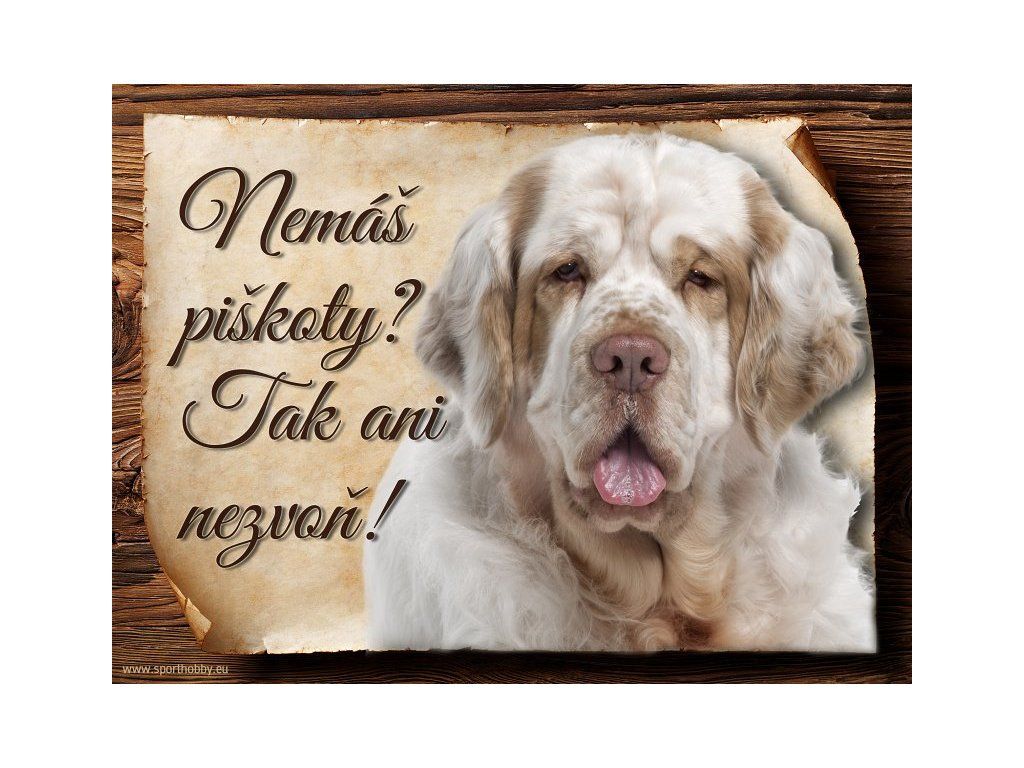 Cedulka Clumber španěl, hliníková s nápisem "Nemáš piškoty? Tak ani nezvoň!" Kovová výstražná venkovní cedulka oznamující to či ono, že se ve vašem obydlí může návštěvník setkat s vašim čtyřnohým miláčkem a jeho teritoriem. Velikosti těchto cedulek jsou 15x11,25 a 20x15 cm. Cedulky jsou tištěny sublimační technologií Grawerton přímo na plech. Cedulky dodáváme běžně se zakulacenými rohy. Pokud budete chtít na cedulku vlastní text, napište nám jej do poznámky.