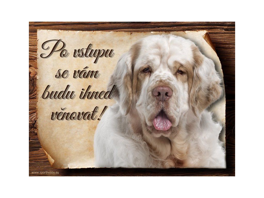 Cedulka Clumber španěl, hliníková s nápisem "Po vstupu se vám budu hned věnovat!" Kovová výstražná venkovní cedulka oznamující to či ono, že se ve vašem obydlí může návštěvník setkat s vašim čtyřnohým miláčkem a jeho teritoriem. Velikosti těchto cedulek jsou 15x11,25 a 20x15 cm. Cedulky jsou tištěny sublimační technologií Grawerton přímo na plech. Cedulky dodáváme běžně se zakulacenými rohy. Pokud budete chtít na cedulku vlastní text, napište nám jej do poznámky.