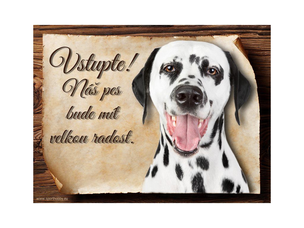 Cedulka s Dalmatinem II, hliníková s nápisem "Vstupte! Náš pes bude mít velkou radost!" Kovová výstražná venkovní cedulka oznamující to či ono, že se ve vašem obydlí může návštěvník setkat s vašim čtyřnohým miláčkem a jeho teritoriem. Velikosti těchto cedulek jsou 15x11,25 a 20x15 cm. Cedulky jsou tištěny sublimační technologií Grawerton přímo na plech. Cedulky dodáváme běžně se zakulacenými rohy. Pokud budete chtít na cedulku vlastní text, napište nám jej do poznámky.