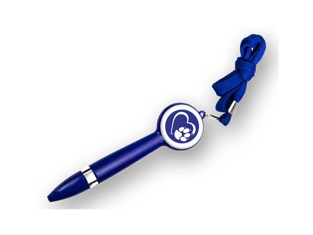 Propisovací pero s logem a šňůrkou na krk v modré barvě. Velikost pera je 13 cm.