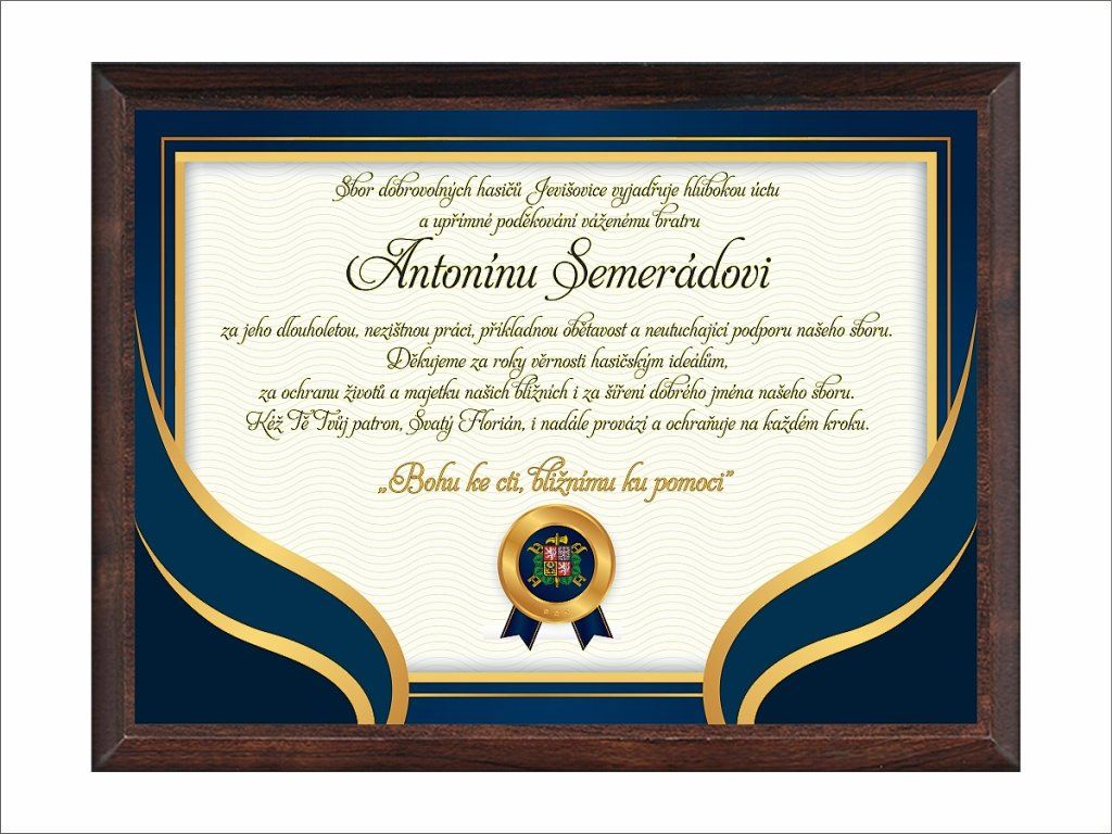 Poznámka: Uvedený text na plaketě je pouze ilustrační. Vlastní text si můžete libovolně navrhnout po vložení do košíku nebo jej uvést do poznámky v objednávce.