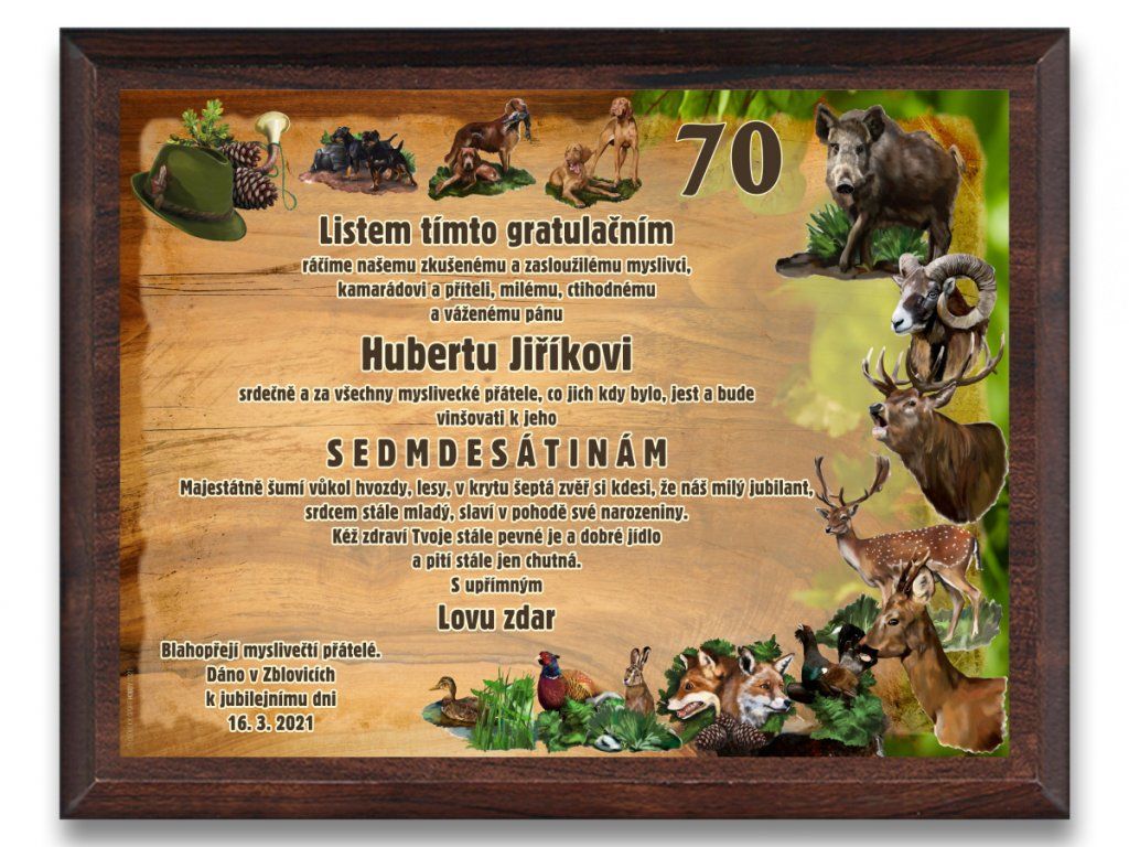 Hledáte důstojný způsob, jak věnovat originální dar k jubileu? Naše samostatné desky v luxusním provedení ořech tvoří dokonalý základ pro vaše individuální nápady. Tato kovová deska je umístěn na mdf podložku v provedení ořech, která je v ceně výrobku. Je možné zavěšení na stěnu, nebo postavení do stojánku. Text je pouze informativní - smyšlený. Lze jej libovolně editovat po vložení do košíku a nebo uvést do poznámky.