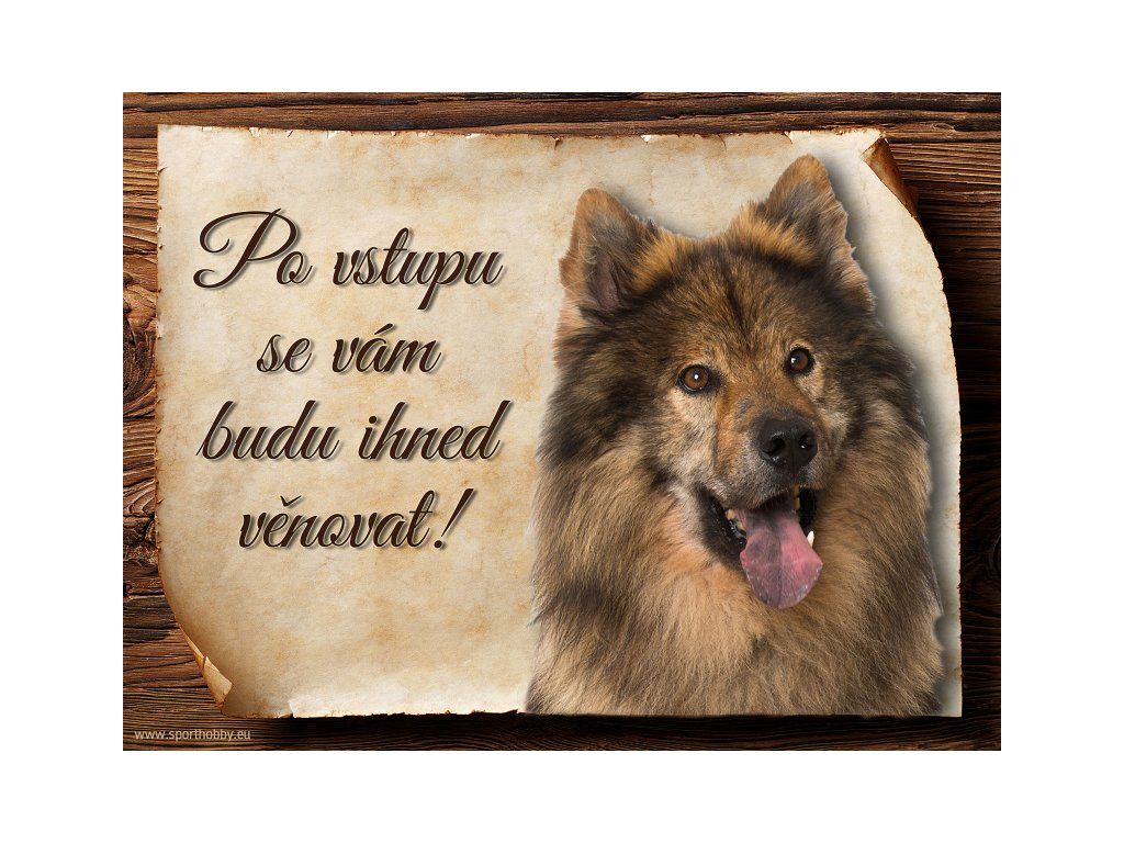 Cedulka s Eurasier II, hliníková s nápisem "Po vstupu se vám budu hned věnovat!" Kovová výstražná venkovní cedulka oznamující to či ono, že se ve vašem obydlí může návštěvník setkat s vašim čtyřnohým miláčkem a jeho teritoriem. Velikosti těchto cedulek jsou 15x11,25 a 20x15 cm. Cedulky jsou tištěny sublimační technologií Grawerton přímo na plech. Cedulky dodáváme běžně se zakulacenými rohy. Pokud budete chtít na cedulku vlastní text, napište nám jej do poznámky.