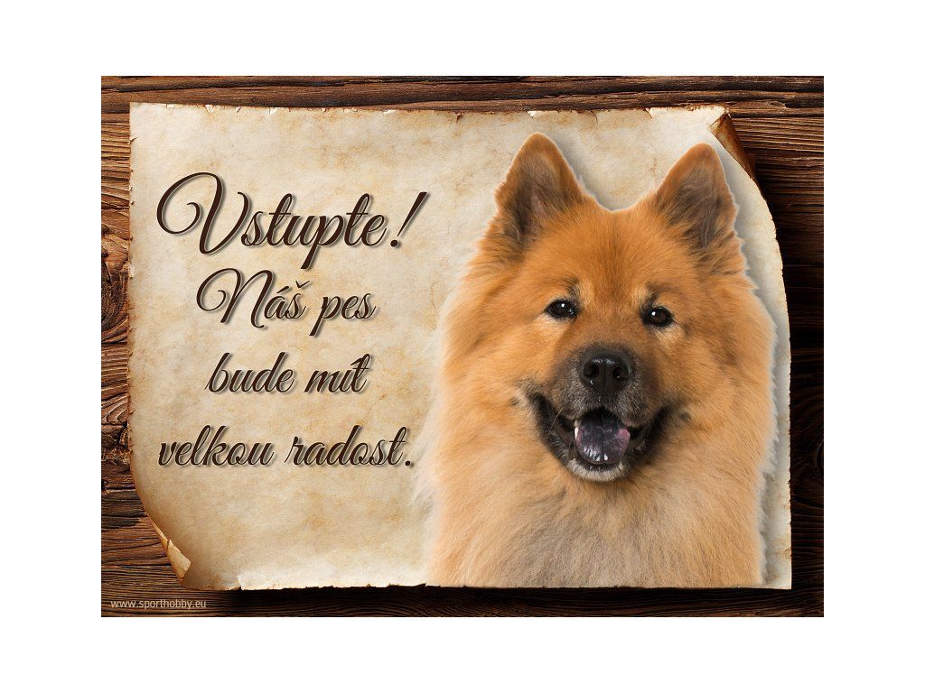Cedulka s Eurasier, hliníková s nápisem "Vstupte! Náš pes bude mít velkou radost!" Kovová výstražná venkovní tabulka oznamující to či ono, že se ve vašem obydlí může návštěvník setkat s vašim čtyřnohým miláčkem a jeho teritoriem. Velikosti těchto cedulek jsou 15x11,25 a 20x15 cm. Cedulky jsou tištěny sublimační technologií Grawerton přímo na plech. Cedulky dodáváme běžně se zakulacenými rohy. Pokud budete chtít na cedulku vlastní text, napište nám jej do poznámky.