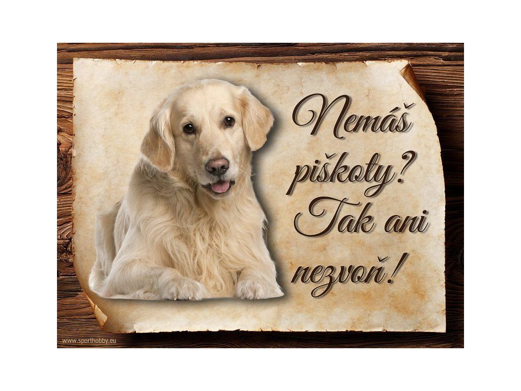 Cedulka s Retrieverem I, hliníková s nápisem "Nemáš piškoty? Tak ani nezvoň!" Kovová výstražná venkovní cedulka oznamující to či ono, že se ve vašem obydlí může návštěvník setkat s vašim čtyřnohým miláčkem a jeho teritoriem. Velikosti těchto cedulek jsou 15x11,25 a 20x15 cm. Cedulky jsou tištěny sublimační technologií Grawerton přímo na plech. Cedulky dodáváme běžně se zakulacenými rohy. Pokud budete chtít na cedulku vlastní text, napište nám jej do poznámky.