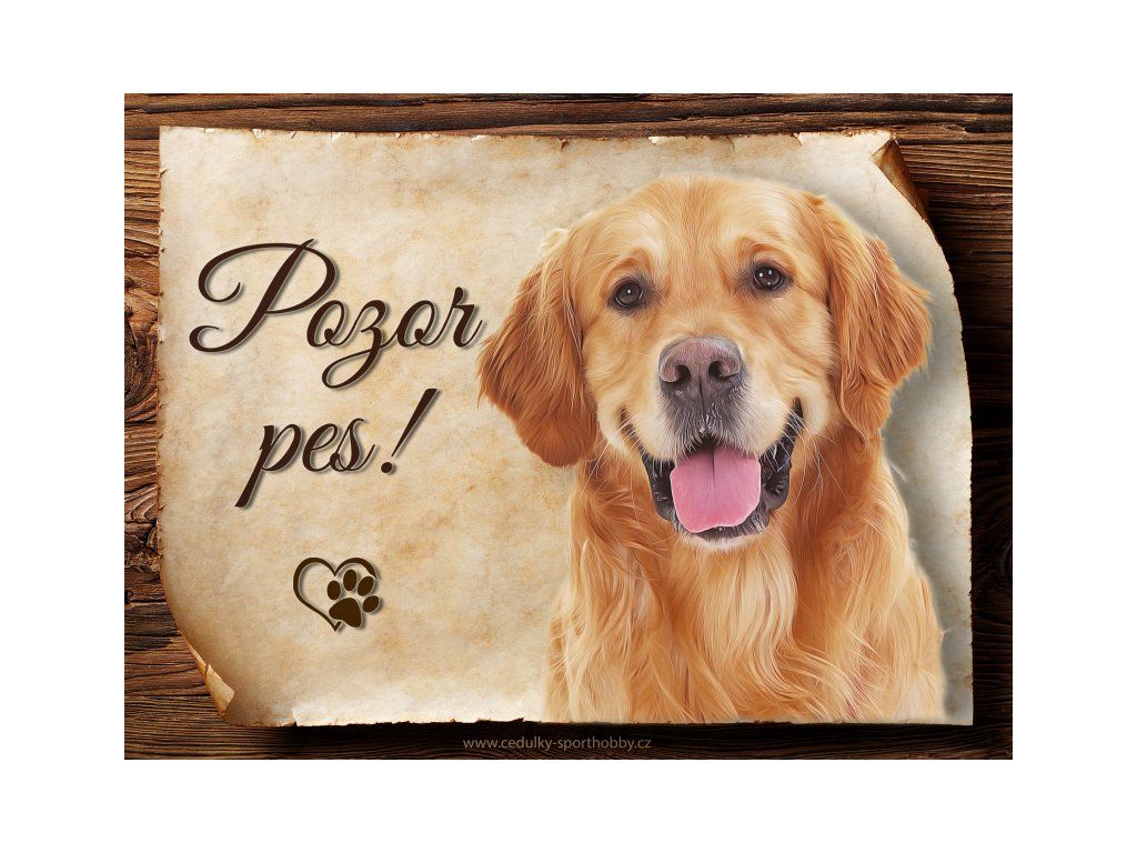 Cedulka s Golden retriever II, hliníková s nápisem "Pozor pes!" Kovová výstražná venkovní cedulka oznamující to či ono, že se ve vašem obydlí může návštěvník setkat s vašim čtyřnohým miláčkem a jeho teritoriem. Velikosti těchto cedulek jsou 15x11,25 a 20x15 a 27x20 cm. Cedulky jsou tištěny sublimační technologií Grawerton přímo na plech. Cedulky dodáváme běžně se zakulacenými rohy. Pokud budete chtít na cedulku vlastní text, napište nám jej do poznámky.