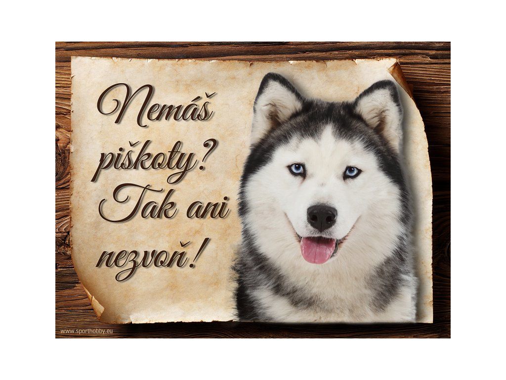 Cedulka Husky, hliníková s nápisem "Nemáš piškoty? Tak ani nezvoň!" Kovová výstražná venkovní cedulka oznamující to či ono, že se ve vašem obydlí může návštěvník setkat s vašim čtyřnohým miláčkem a jeho teritoriem. Velikosti těchto cedulek jsou 15x11,25 a 20x15 cm. Cedulky jsou tištěny sublimační technologií Grawerton přímo na plech. Cedulky dodáváme běžně se zakulacenými rohy. Pokud budete chtít na cedulku vlastní text, napište nám jej do poznámky.