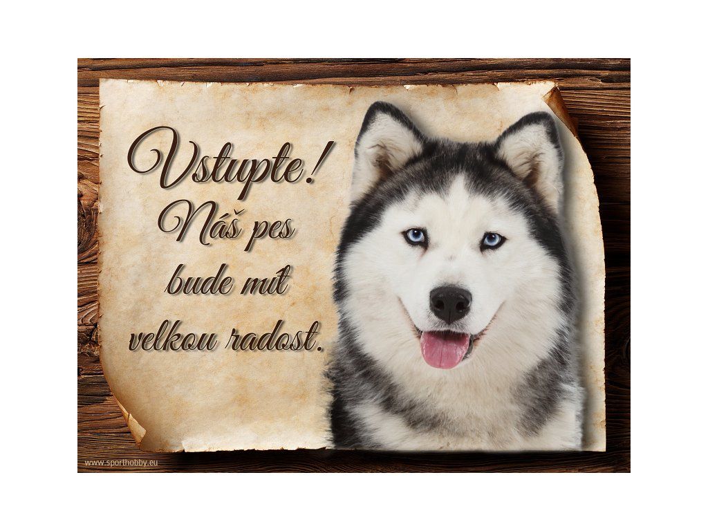 Cedulka Husky, hliníková s nápisem "Vstupte! Náš pes bude mít velkou radost!" Kovová výstražná venkovní cedulka oznamující to či ono, že se ve vašem obydlí může návštěvník setkat s vašim čtyřnohým miláčkem a jeho teritoriem. Velikosti těchto cedulek jsou 15x11,25 a 20x15 cm. Cedulky jsou tištěny sublimační technologií Grawerton přímo na plech. Cedulky dodáváme běžně se zakulacenými rohy. Pokud budete chtít na cedulku vlastní text, napište nám jej do poznámky.