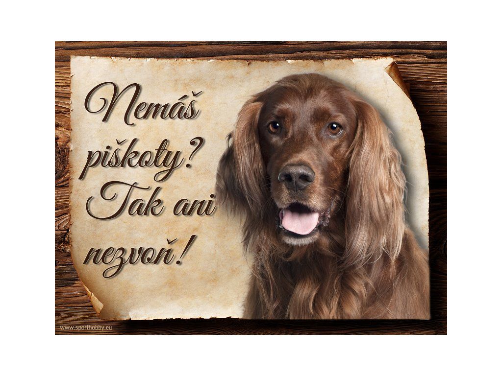 Cedulka Irský setr, hliníková s nápisem "Nemáš piškoty? Tak ani nezvoň!" Kovová výstražná venkovní cedulka oznamující to či ono, že se ve vašem obydlí může návštěvník setkat s vašim čtyřnohým miláčkem a jeho teritoriem. Velikosti těchto cedulek jsou 15x11,25 a 20x15 cm. Cedulky jsou tištěny sublimační technologií Grawerton přímo na plech. Cedulky dodáváme běžně se zakulacenými rohy. Pokud budete chtít na cedulku vlastní text, napište nám jej do poznámky.