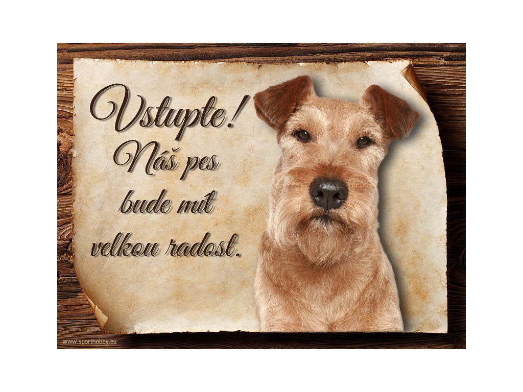 Cedulka Irský teriér, hliníková s nápisem "Vstupte! Náš pes bude mít velkou radost!" Kovová výstražná venkovní cedulka oznamující to či ono, že se ve vašem obydlí může návštěvník setkat s vašim čtyřnohým miláčkem a jeho teritoriem. Velikosti těchto cedulek jsou 15x11,25 a 20x15 cm. Cedulky jsou tištěny sublimační technologií Grawerton přímo na plech. Cedulky dodáváme běžně se zakulacenými rohy. Pokud budete chtít na cedulku vlastní text, napište nám jej do poznámky.