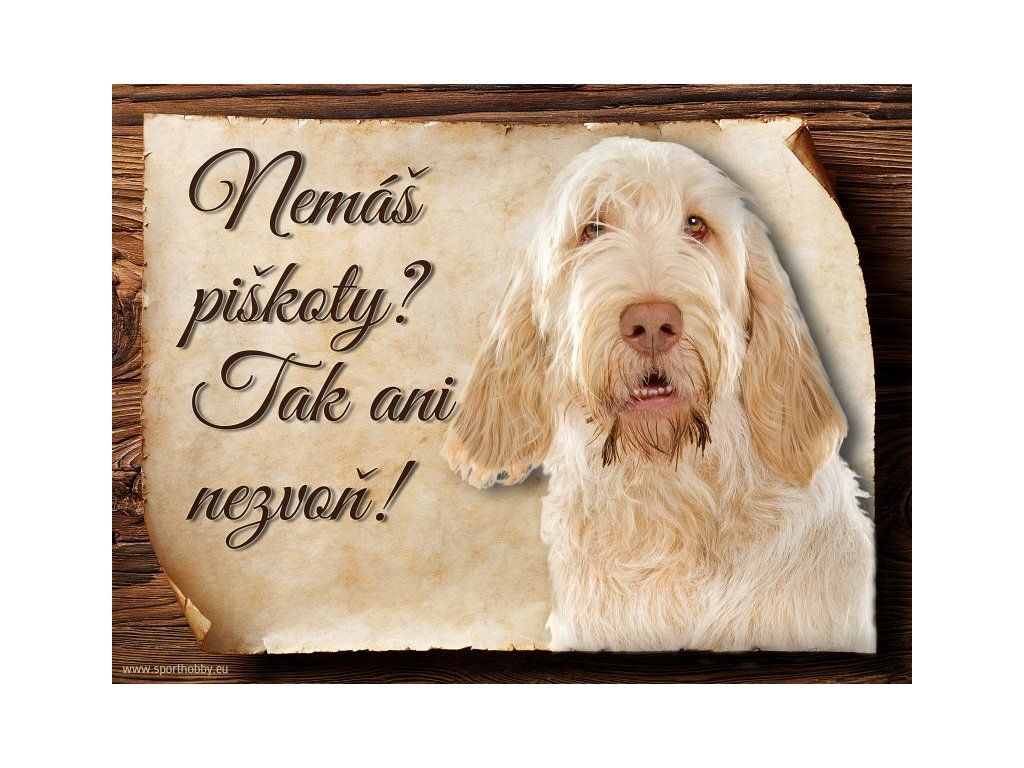 Cedulka s Italským spinonem, hliníková s nápisem "Nemáš piškoty? Tak ani nezvoň!" Kovová výstražná venkovní cedulka oznamující to či ono, že se ve vašem obydlí může návštěvník setkat s vašim čtyřnohým miláčkem a jeho teritoriem. Velikosti těchto cedulek jsou 15x11,25 a 20x15 cm. Cedulky jsou tištěny sublimační technologií Grawerton přímo na plech. Cedulky dodáváme běžně se zakulacenými rohy. Pokud budete chtít na cedulku vlastní text, napište nám jej do poznámky.