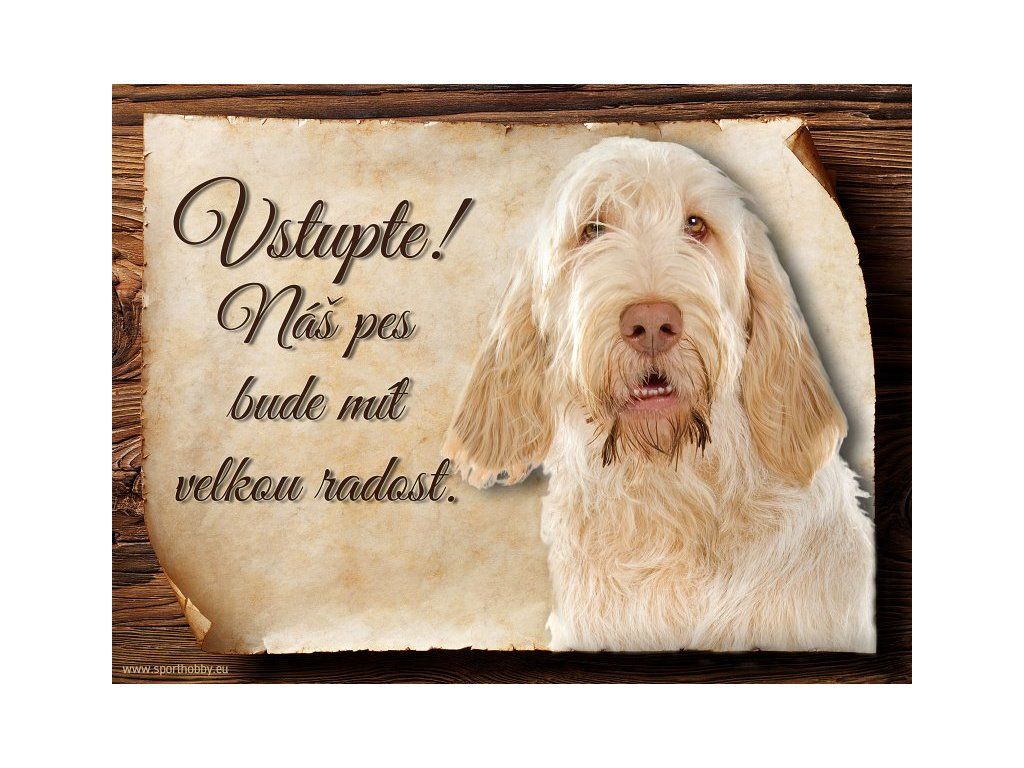Cedulka s Italským spinonem, hliníková s nápisem "Vstupte! Náš pes bude mít velkou radost!" Kovová výstražná venkovní cedulka oznamující to či ono, že se ve vašem obydlí může návštěvník setkat s vašim čtyřnohým miláčkem a jeho teritoriem. Velikosti těchto cedulek jsou 15x11,25 a 20x15 cm. Cedulky jsou tištěny sublimační technologií Grawerton přímo na plech. Cedulky dodáváme běžně se zakulacenými rohy. Pokud budete chtít na cedulku vlastní text, napište nám jej do poznámky.