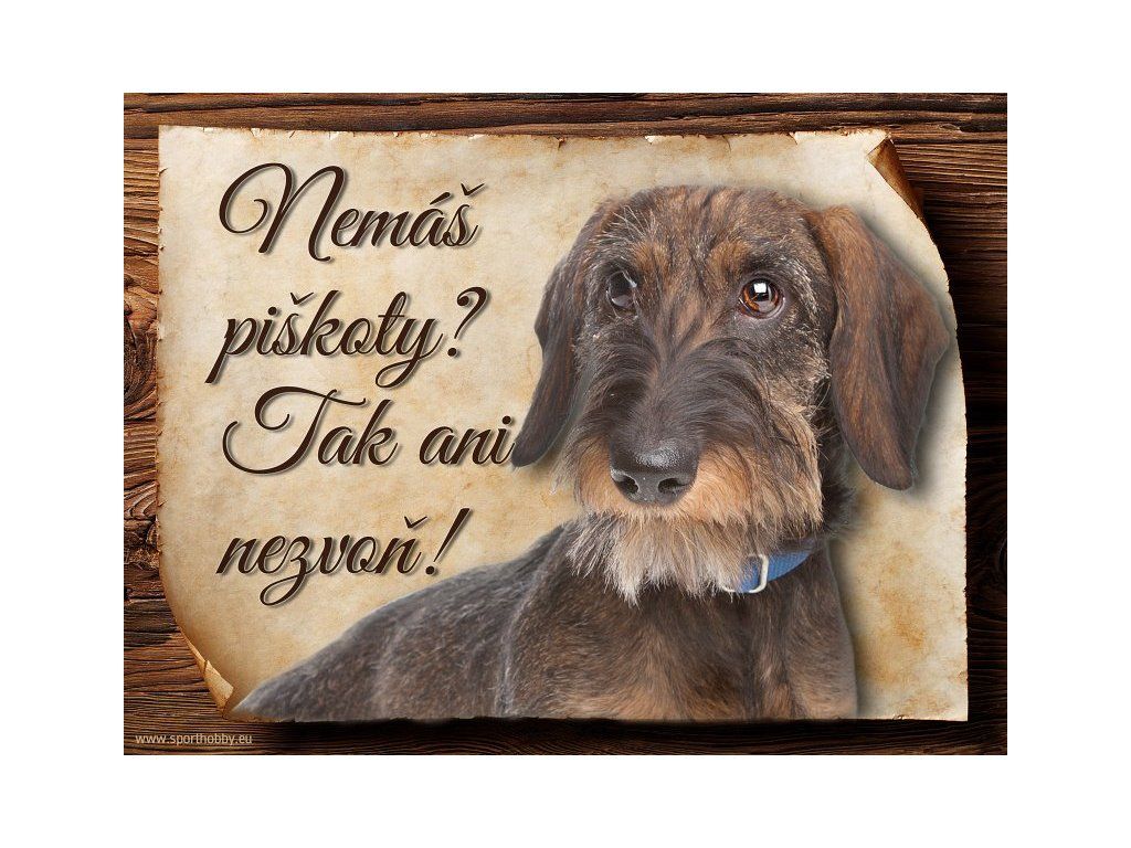 Cedulka s Jezevčíkem hrubosrstým, hliníková s nápisem "Nemáš piškoty? Tak ani nezvoň!" Kovová výstražná venkovní cedulka oznamující to či ono, že se ve vašem obydlí může návštěvník setkat s vašim čtyřnohým miláčkem a jeho teritoriem. Velikosti těchto cedulek jsou 15x11,25 a 20x15 cm. Cedulky jsou tištěny sublimační technologií Grawerton přímo na plech. Cedulky dodáváme běžně se zakulacenými rohy. Pokud budete chtít na cedulku vlastní text, napište nám jej do poznámky.