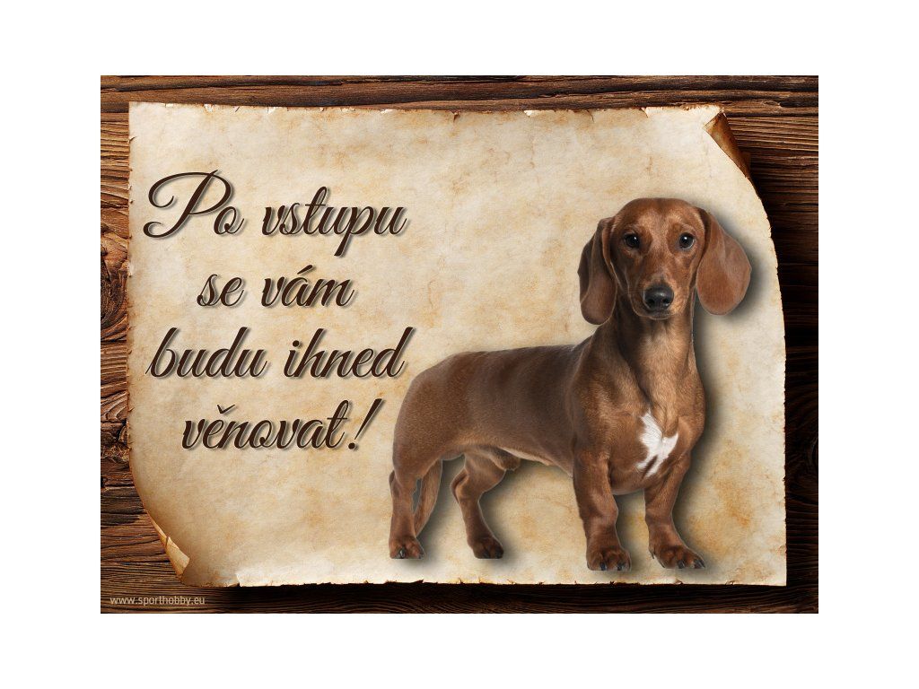 Cedulka s Jezevčíkem, hliníková s nápisem "Po vstupu se vám budu hned věnovat!" Kovová výstražná venkovní cedulka oznamující to či ono, že se ve vašem obydlí může návštěvník setkat s vašim čtyřnohým miláčkem a jeho teritoriem. Velikosti těchto cedulek jsou 15x11,25 a 20x15 cm. Cedulky jsou tištěny sublimační technologií Grawerton přímo na plech. Cedulky dodáváme běžně se zakulacenými rohy. Pokud budete chtít na cedulku vlastní text, napište nám jej do poznámky.