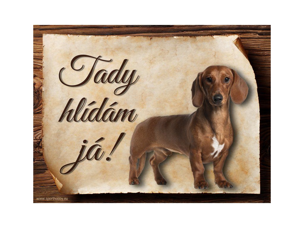 Cedulka s Jezevčíkem, hliníková s nápisem "Tady hlídám já!" Kovová výstražná venkovní cedulka oznamující to či ono, že se ve vašem obydlí může návštěvník setkat s vašim čtyřnohým miláčkem a jeho teritoriem. Velikosti těchto cedulek jsou 15x11,25 a 20x15 cm. Cedulky jsou tištěny sublimační technologií Grawerton přímo na plech. Cedulky dodáváme běžně se zakulacenými rohy. Pokud budete chtít na cedulku vlastní text, napište nám jej do poznámky.