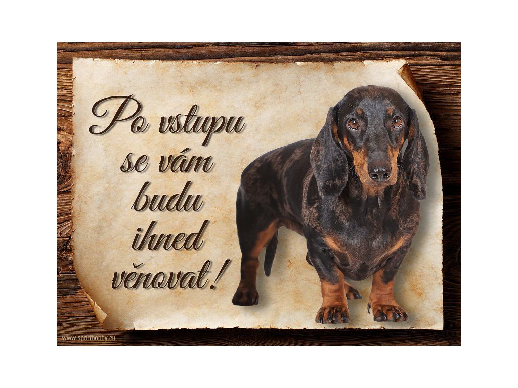 Cedulka s Jezevčík VI, hliníková s nápisem "Po vstupu se vám budu hned věnovat!" Kovová výstražná venkovní cedulka oznamující to či ono, že se ve vašem obydlí může návštěvník setkat s vašim čtyřnohým miláčkem a jeho teritoriem. Velikosti těchto cedulek jsou 15x11,25 a 20x15 cm. Cedulky jsou tištěny sublimační technologií Grawerton přímo na plech. Cedulky dodáváme běžně se zakulacenými rohy. Pokud budete chtít na cedulku vlastní text, napište nám jej do poznámky.
