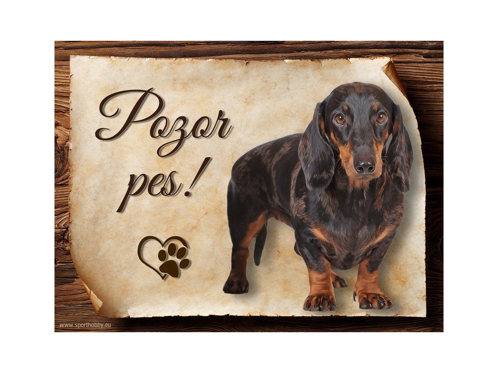 Cedulka s Jezevčík VI, hliníková s nápisem "Pozor pes!" Kovová výstražná venkovní cedulka oznamující to či ono, že se ve vašem obydlí může návštěvník setkat s vašim čtyřnohým miláčkem a jeho teritoriem. Velikosti těchto cedulek jsou 15x11,25 a 20x15 cm. Cedulky jsou tištěny sublimační technologií Grawerton přímo na plech. Cedulky dodáváme běžně se zakulacenými rohy. Pokud budete chtít na cedulku vlastní text, napište nám jej do poznámky.