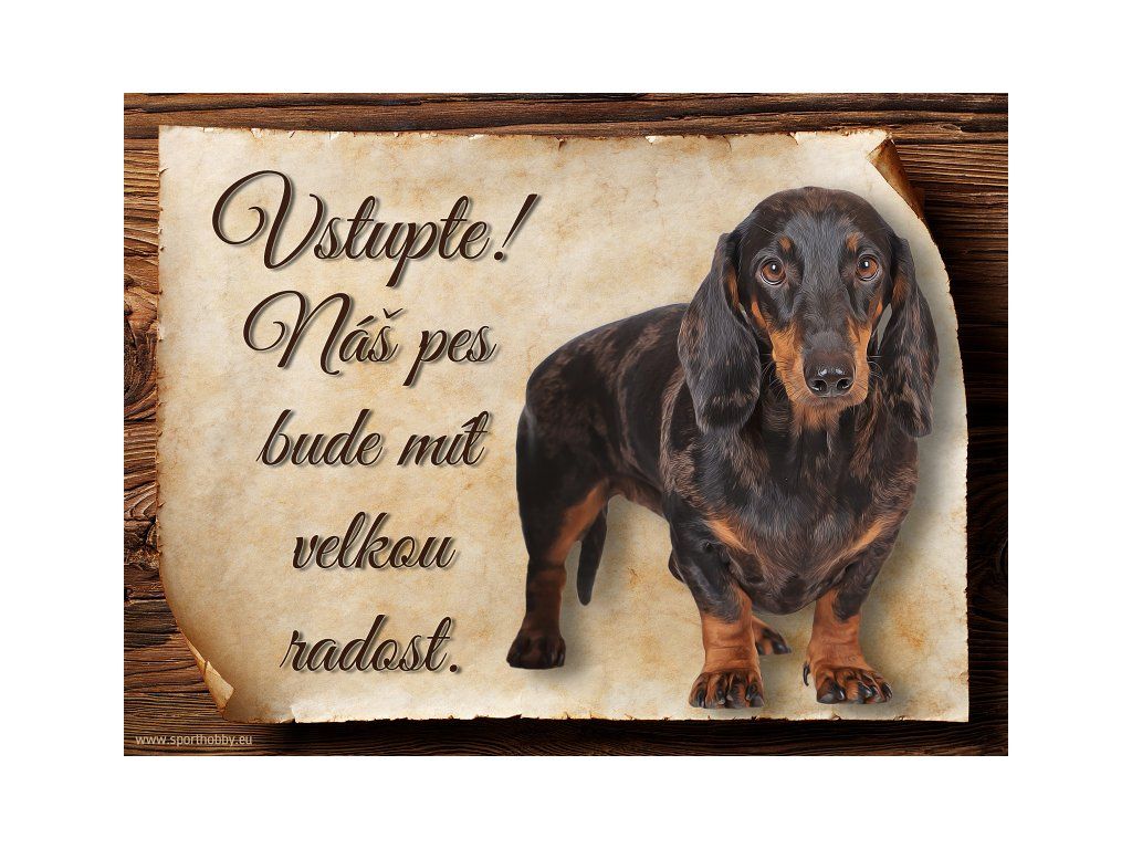 Cedulka s Jezevčík VI, hliníková s nápisem "Vstupte! Náš pes bude mít velkou radost!" Kovová výstražná venkovní cedulka oznamující to či ono, že se ve vašem obydlí může návštěvník setkat s vašim čtyřnohým miláčkem a jeho teritoriem. Velikosti těchto cedulek jsou 15x11,25 a 20x15 cm. Cedulky jsou tištěny sublimační technologií Grawerton přímo na plech. Cedulky dodáváme běžně se zakulacenými rohy. Pokud budete chtít na cedulku vlastní text, napište nám jej do poznámky.