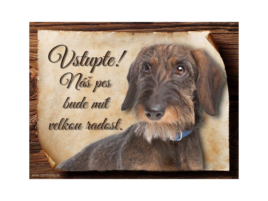 Cedulka s Jezevčíkem, hliníková s nápisem "Vstupte! Náš pes bude mít velkou radost!" Kovová výstražná venkovní cedulka oznamující to či ono, že se ve vašem obydlí může návštěvník setkat s vašim čtyřnohým miláčkem a jeho teritoriem. Velikosti těchto cedulek jsou 15x11,25 a 20x15 cm. Cedulky jsou tištěny sublimační technologií Grawerton přímo na plech. Cedulky dodáváme běžně se zakulacenými rohy. Pokud budete chtít na cedulku vlastní text, napište nám jej do poznámky.
