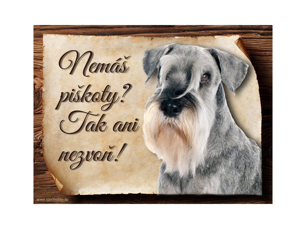 Cedulka Knírač, hliníková s nápisem "Nemáš piškoty? Tak ani nezvoň!" Kovová výstražná venkovní cedulka oznamující to či ono, že se ve vašem obydlí může návštěvník setkat s vašim čtyřnohým miláčkem a jeho teritoriem. Velikosti těchto cedulek jsou 15x11,25 a 20x15 cm. Cedulky jsou tištěny sublimační technologií Grawerton přímo na plech. Cedulky dodáváme běžně se zakulacenými rohy. Pokud budete chtít na cedulku vlastní text, napište nám jej do poznámky.