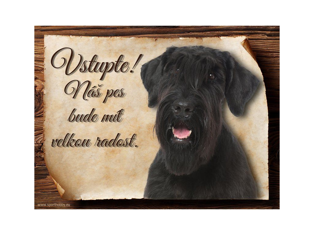 Cedulka Knírač velký, hliníková s nápisem "Vstupte! Náš pes bude mít velkou radost!" Kovová výstražná venkovní cedulka oznamující to či ono, že se ve vašem obydlí může návštěvník setkat s vašim čtyřnohým miláčkem a jeho teritoriem. Velikosti těchto cedulek jsou 15x11,25 a 20x15 cm. Cedulky jsou tištěny sublimační technologií Grawerton přímo na plech. Cedulky dodáváme běžně se zakulacenými rohy. Pokud budete chtít na cedulku vlastní text, napište nám jej do poznámky.