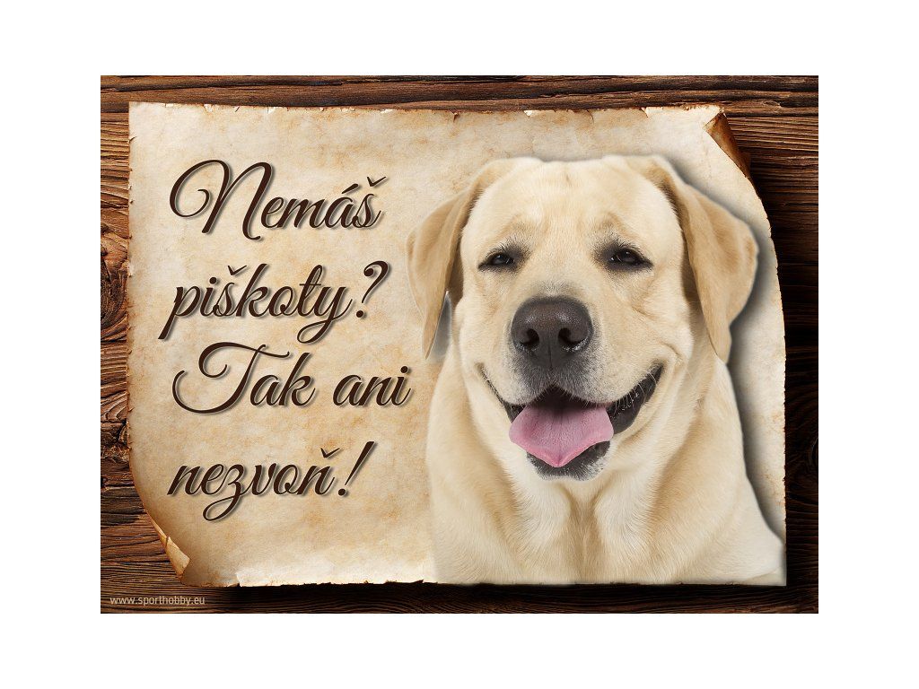 Cedulka Labradorský retrívr, hliníková s nápisem "Nemáš piškoty? Tak ani nezvoň!" Kovová výstražná venkovní cedulka oznamující to či ono, že se ve vašem obydlí může návštěvník setkat s vašim čtyřnohým miláčkem a jeho teritoriem. Velikosti těchto cedulek jsou 15x11,25, 20x15 cm a 27x20.. Cedulky jsou tištěny sublimační technologií Grawerton přímo na plech. Cedulky dodáváme běžně se zakulacenými rohy. Pokud budete chtít na cedulku vlastní text, napište nám jej do poznámky.