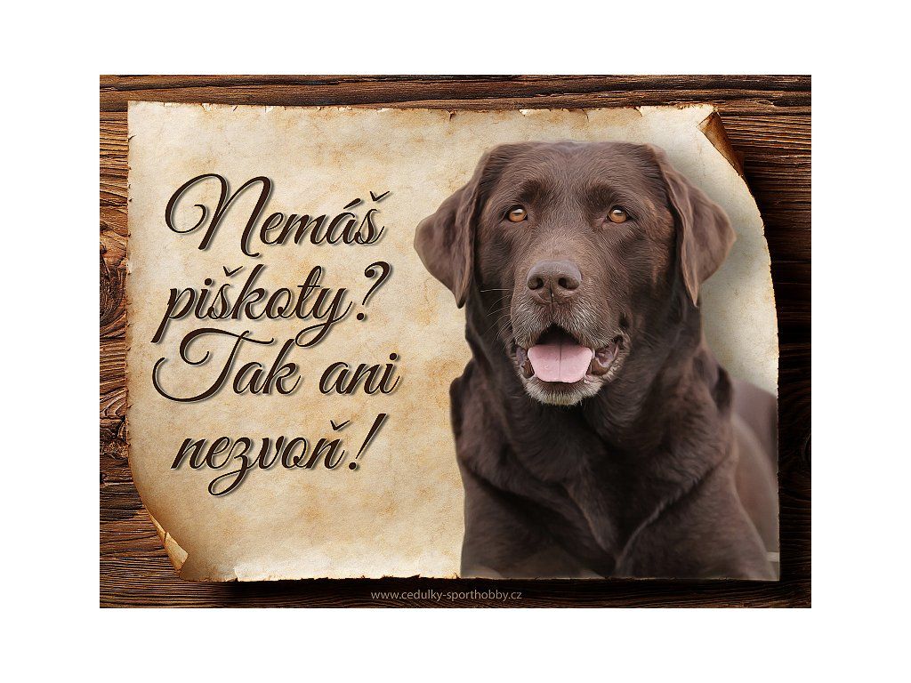 Cedulka Labradorský retrívr, hliníková s nápisem "Nemáš piškoty? Tak ani nezvoň!" Kovová výstražná venkovní cedulka oznamující to či ono, že se ve vašem obydlí může návštěvník setkat s vašim čtyřnohým miláčkem a jeho teritoriem. Velikosti těchto cedulek jsou 15x11,25, 20x15 cm a 27x20. Cedulky jsou tištěny sublimační technologií Grawerton přímo na plech. Cedulky dodáváme běžně se zakulacenými rohy. Pokud budete chtít na cedulku vlastní text, napište nám jej do poznámky.