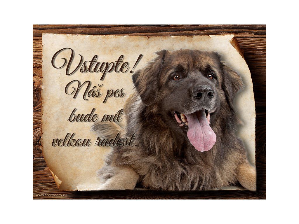 Cedulka s Leonbergerem II, hliníková s nápisem "Vstupte! Náš pes bude mít velkou radost!" Kovová výstražná venkovní cedulka oznamující to či ono, že se ve vašem obydlí může návštěvník setkat s vašim čtyřnohým miláčkem a jeho teritoriem. Velikosti těchto cedulek jsou 15x11,25 a 20x15 cm. Cedulky jsou tištěny sublimační technologií Grawerton přímo na plech. Cedulky dodáváme běžně se zakulacenými rohy. Pokud budete chtít na cedulku vlastní text, napište nám jej do poznámky.