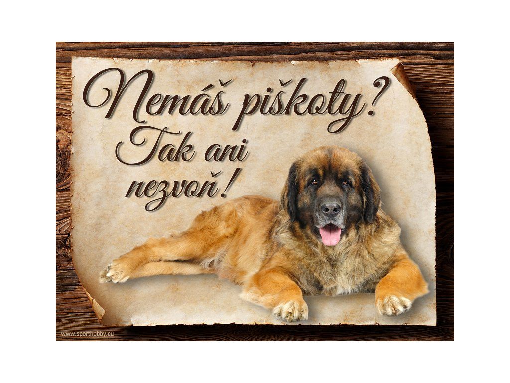 Cedulka s Leonbergerem, hliníková s nápisem "Nemáš piškoty? Tak ani nezvoň!" Kovová výstražná venkovní cedulka oznamující to či ono, že se ve vašem obydlí může návštěvník setkat s vašim čtyřnohým miláčkem a jeho teritoriem. Velikosti těchto cedulek jsou 15x11,25 a 20x15 cm. Cedulky jsou tištěny sublimační technologií Grawerton přímo na plech. Cedulky dodáváme běžně se zakulacenými rohy. Pokud budete chtít na cedulku vlastní text, napište nám jej do poznámky.