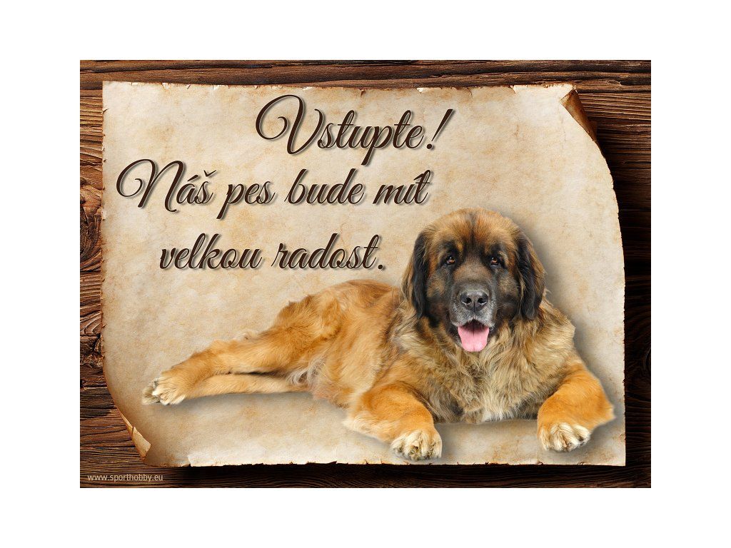 Cedulka s Leonbergerem, hliníková s nápisem "Vstupte! Náš pes bude mít velkou radost!" Kovová výstražná venkovní cedulka oznamující to či ono, že se ve vašem obydlí může návštěvník setkat s vašim čtyřnohým miláčkem a jeho teritoriem. Velikosti těchto cedulek jsou 15x11,25 a 20x15 cm. Cedulky jsou tištěny sublimační technologií Grawerton přímo na plech. Cedulky dodáváme běžně se zakulacenými rohy. Pokud budete chtít na cedulku vlastní text, napište nám jej do poznámky.