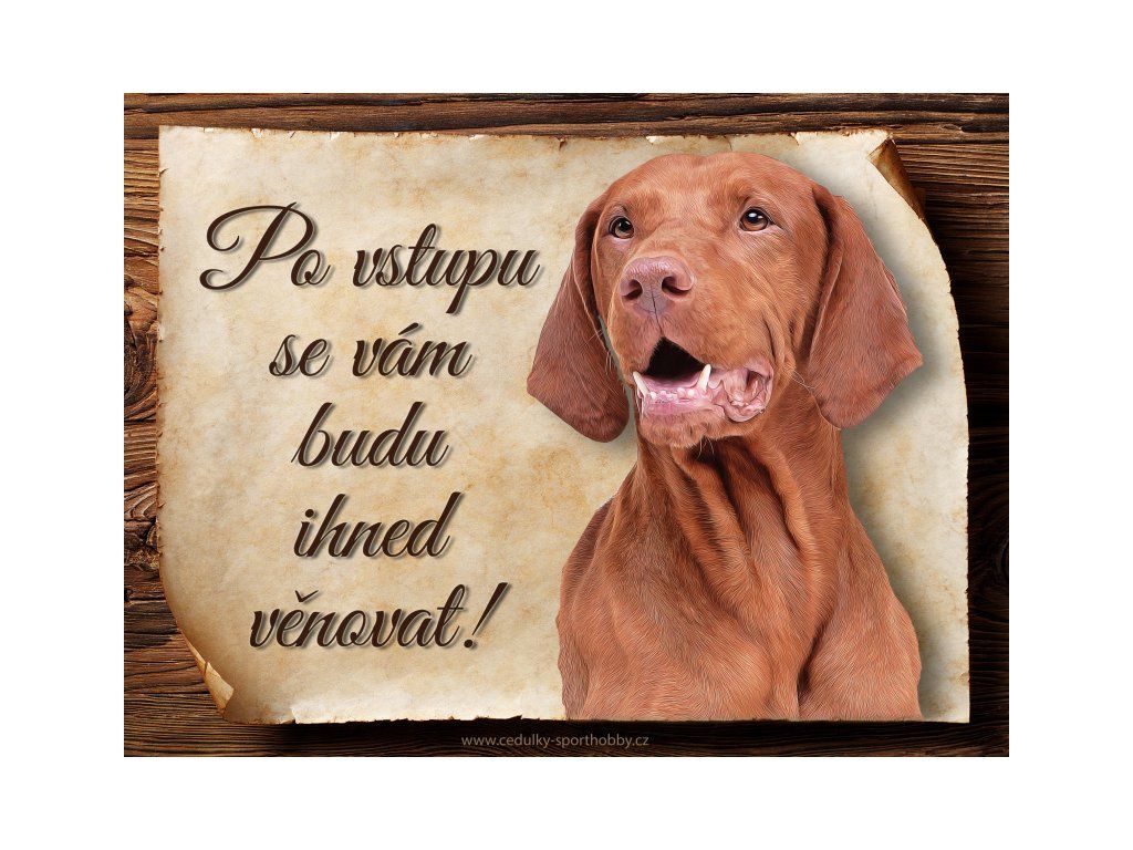 Cedulka s Maďarským ohařem II, hliníková s nápisem "Po vstupu se vám budu hned věnovat!" Kovová výstražná venkovní cedulka oznamující to či ono, že se ve vašem obydlí může návštěvník setkat s vašim čtyřnohým miláčkem a jeho teritoriem. Velikosti těchto cedulek jsou 15x11,25 a 20x15 cm. Cedulky jsou tištěny sublimační technologií Grawerton přímo na plech. Cedulky dodáváme běžně se zakulacenými rohy. Pokud budete chtít na cedulku vlastní text, napište nám jej do poznámky.