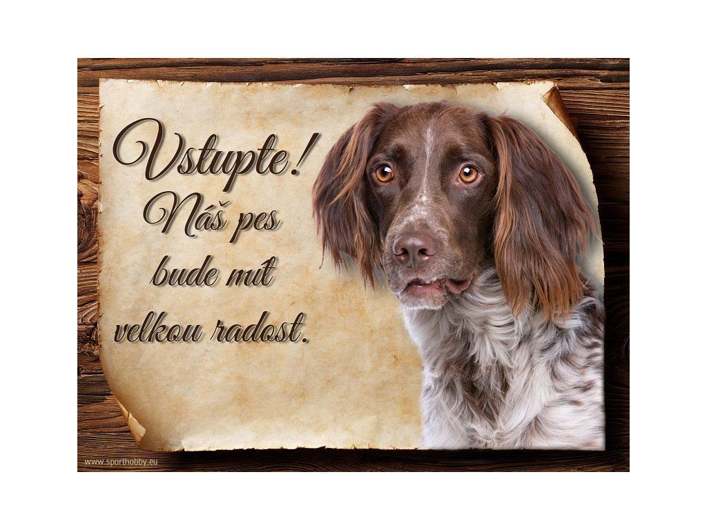Cedulka Münsterlandský ohař, hliníková s nápisem "Vstupte! Náš pes bude mít velkou radost!" Kovová výstražná venkovní cedulka oznamující to či ono, že se ve vašem obydlí může návštěvník setkat s vašim čtyřnohým miláčkem a jeho teritoriem. Velikosti těchto cedulek jsou 15x11,25 a 20x15 cm. Cedulky jsou tištěny sublimační technologií Grawerton přímo na plech. Cedulky dodáváme běžně se zakulacenými rohy. Pokud budete chtít na cedulku vlastní text, napište nám jej do poznámky.