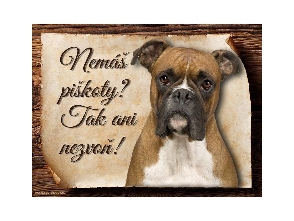 Cedulka s Boxerem, hliníková s nápisem "Nemáš piškoty? Tak ani nezvoň!" Kovová výstražná venkovní cedulka oznamující to či ono, že se ve vašem obydlí může návštěvník setkat s vašim čtyřnohým miláčkem a jeho teritoriem. Velikosti těchto cedulek jsou 15x11,25, 20x15 a 27x20 cm. Cedulky jsou tištěny sublimační technologií Grawerton přímo na plech. Cedulky dodáváme běžně se zakulacenými rohy. Pokud budete chtít na cedulku vlastní text, napište nám jej do poznámky.