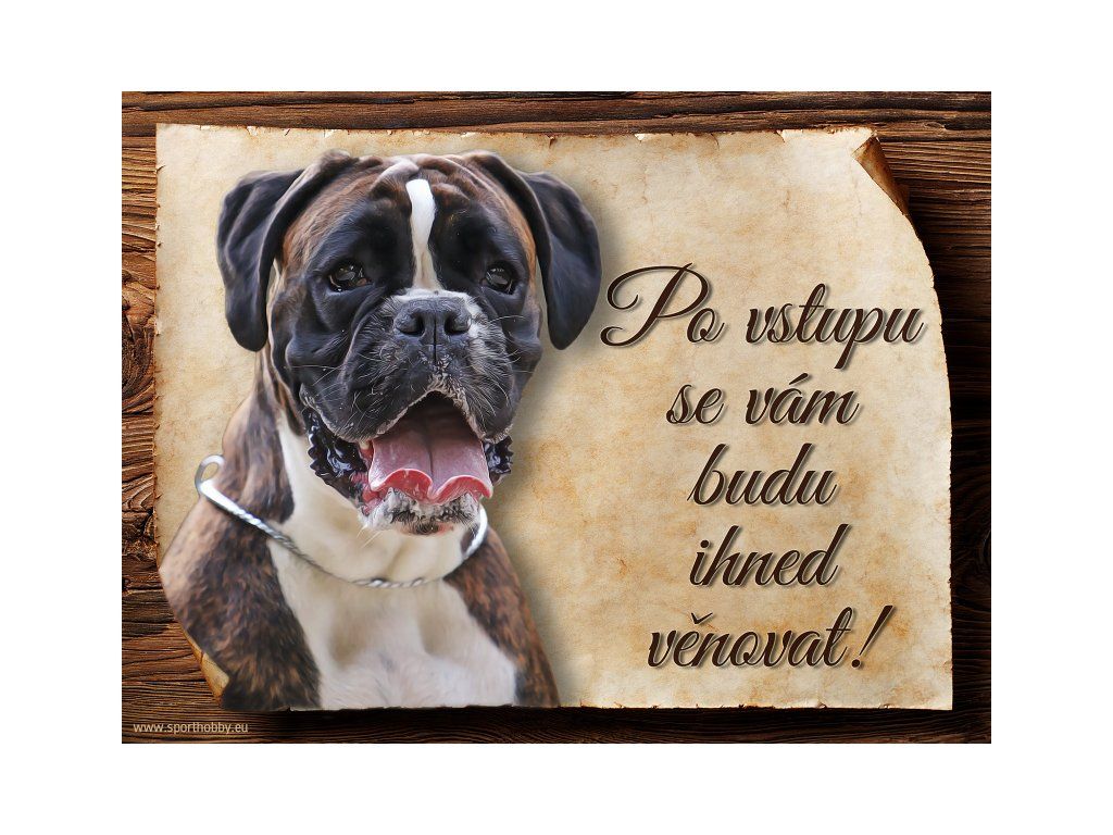 Cedulka s Boxerem III, hliníková s nápisem "Po vstupu se vám budu hned věnovat!" Kovová výstražná venkovní cedulka oznamující to či ono, že se ve vašem obydlí může návštěvník setkat s vašim čtyřnohým miláčkem a jeho teritoriem. Velikosti těchto cedulek jsou 15x11,25, 20x15 a 27x20 cm. Cedulky jsou tištěny sublimační technologií Grawerton přímo na plech. Cedulky dodáváme běžně se zakulacenými rohy. Pokud budete chtít na cedulku vlastní text, napište nám jej do poznámky.