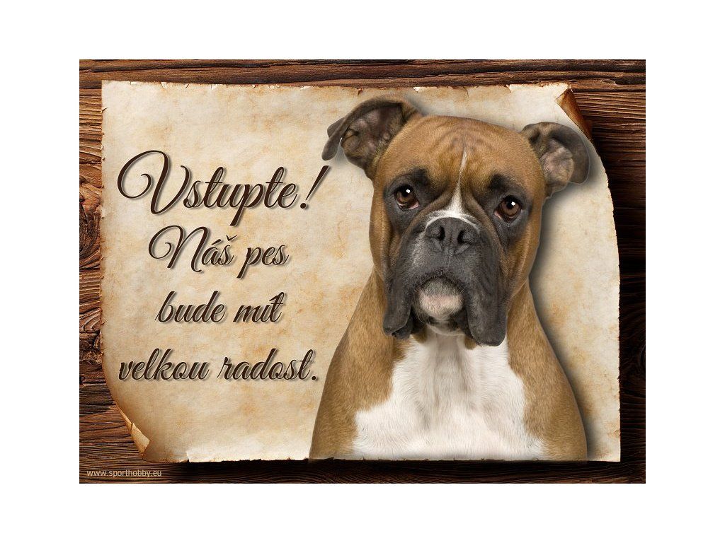 Cedulka s Boxerem, hliníková s nápisem "Vstupte! Náš pes bude mít velkou radost!" Kovová výstražná venkovní tabulka oznamující to či ono, že se ve vašem obydlí může návštěvník setkat s vašim čtyřnohým miláčkem a jeho teritoriem. Velikosti těchto cedulek jsou 15x11,25 a 20x15 cm. Cedulky jsou tištěny sublimační technologií Grawerton přímo na plech. Cedulky dodáváme běžně se zakulacenými rohy. Pokud budete chtít na cedulku vlastní text, napište nám jej do poznámky.
