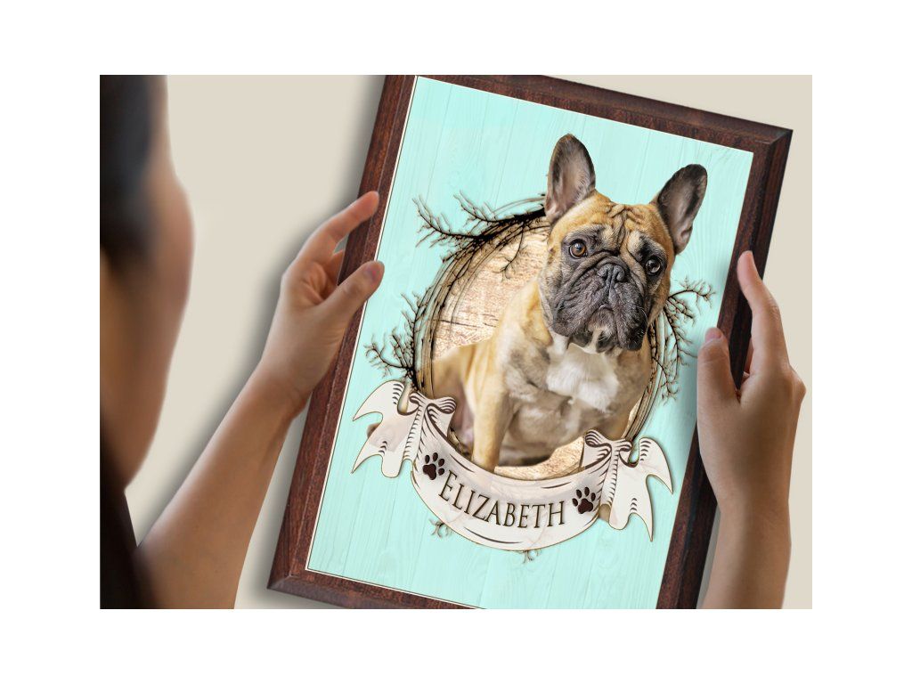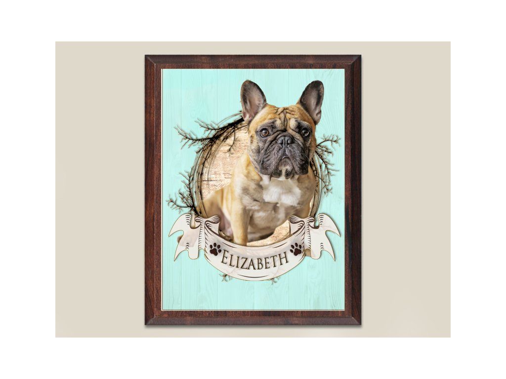 Obraz do bytu, tyrkysové pozadí, s vlastním psem a jménem je vytištěn sublimačním tiskem přímo na hliníkový plech a umístěn mdf podložku barva ořech. Má stálé a syté barvy. Nabízíme tři velikosti obrázků.